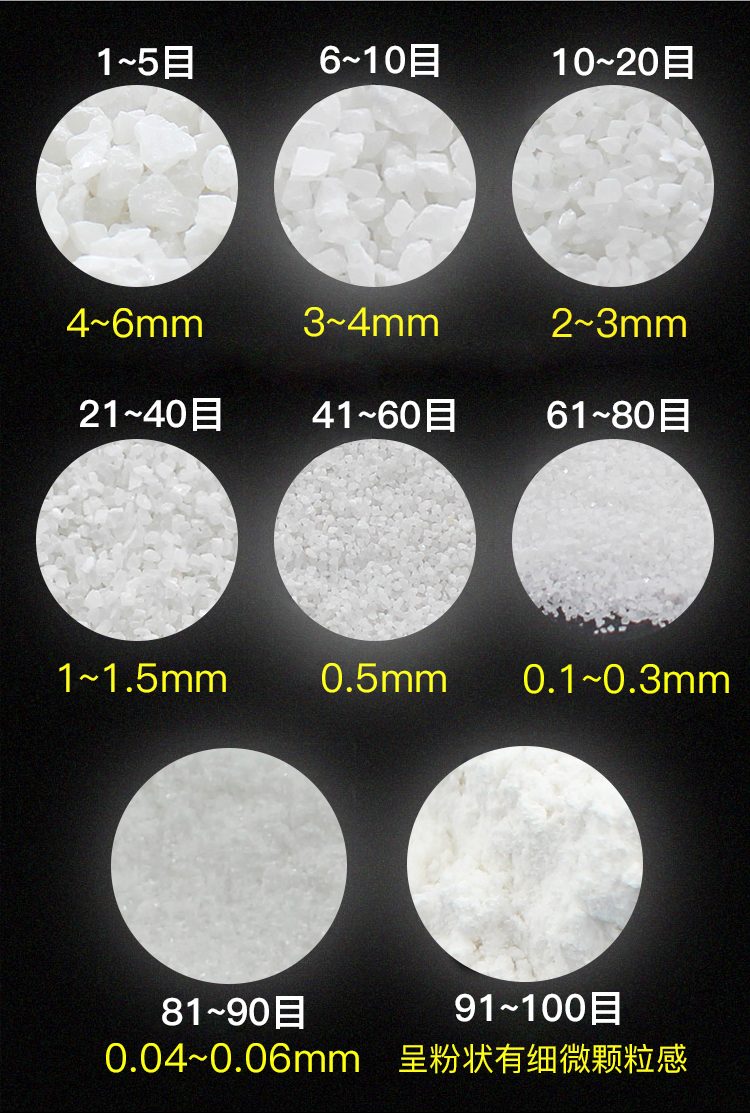 18目-30目,1.1mm-0.60mm;30目-50目,0.60mm-0.35mm;50目-80目,0.35mm-0.20mm;80目-100目,0.20mm-0.170mm;100目-200目,0.170mm-0.076mm。